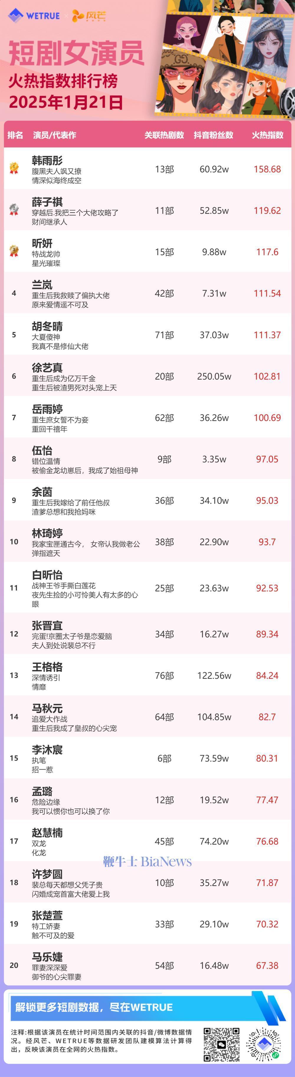 本榜单为短剧女演员&男演员火热指数名次榜。