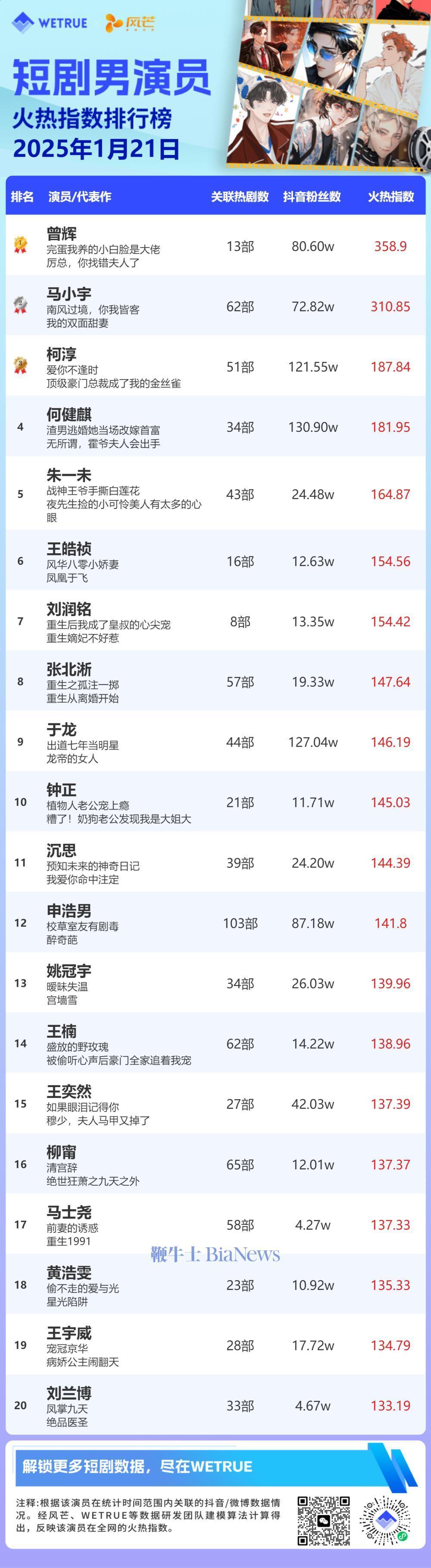 1月22日音书,为匡助短剧从业者提供更多信息,专注于短剧报谈的新腕儿和科技媒体鞭牛士聚会WETRUE短剧热度榜共同推出多种短剧热度榜。