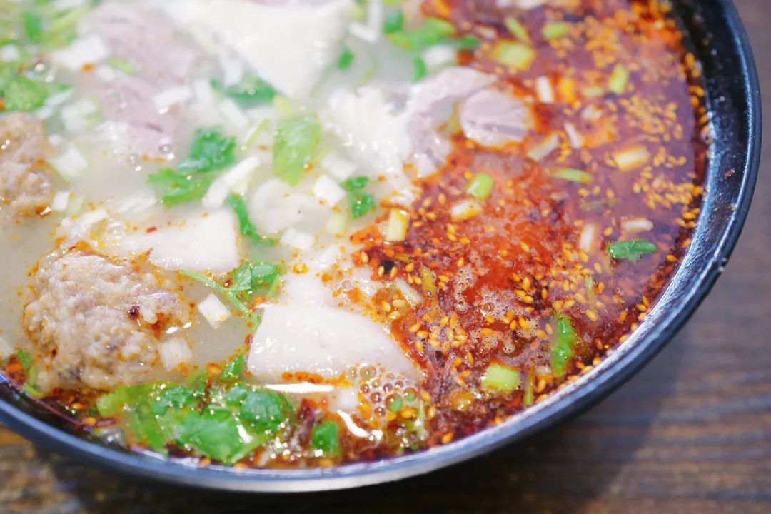 清然羊汤饸饹面:4小时炖出来的羊汤打底,饸饹面顺滑有韧劲,再来一份牛肉作念的炸丸子和酥肉放进汤里,厚味不腻。能吃辣的一定要试试羊油辣椒,香,完全不膻。