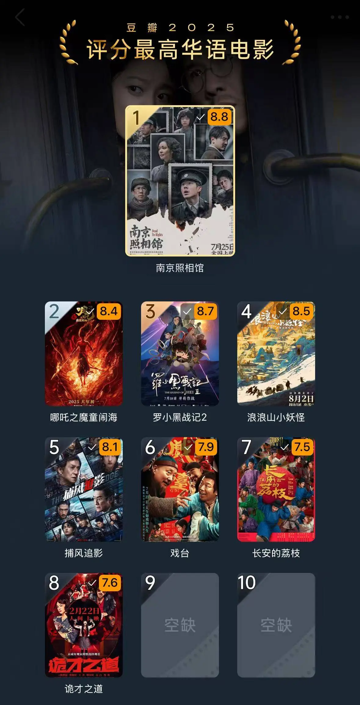 2025年豆瓣年度评分最高华语电影的榜单,初度出现了末位空白,仅有八部电影上榜。而前五名中,三部齐是动画电影,且评分在8分以上。